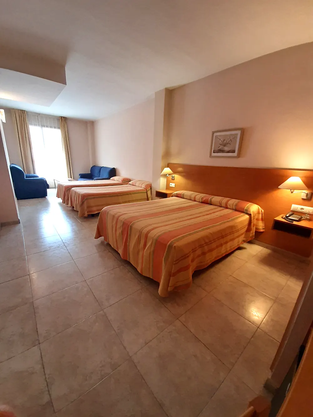 Habitación pensada para familias. Dispone de 1 cama de matrimonio y 2 camas individuales, aire acondicionado, escritorio, nevera pequeña con agua de bienvenida, 2 sillones y mesita, TV, baño privado con bañera o ducha. Habitación amplia y luminosa.